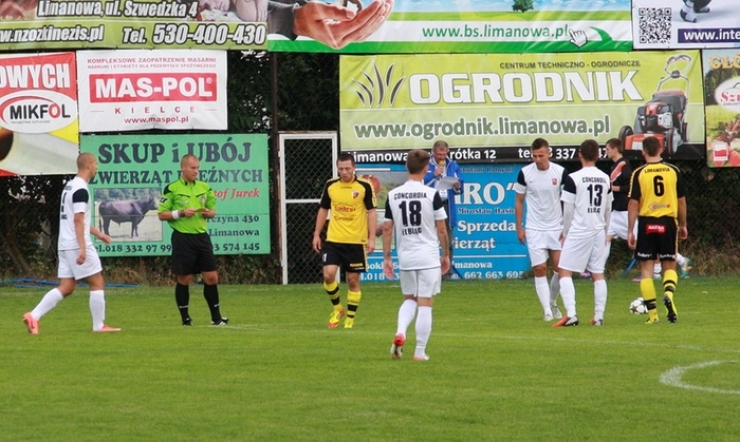 Od pierwszych minut spotkania gospodarze zdecydowanie zaatakowali bramkę gości. Już w 5' spotkania strzał Komorka zablokowany przez obronców Concordii. W 8' Skiba etatowy egzekutor stałych fragmentów gry po raz pierwszy uderza z rzutu wolnego, a przymierzył w długi górny róg bramki, jednak bramkarz gości stanął na wysokosci zadania i piłkę zmierzającą w długi górny róg bramki wyłapał. Podobnie dobrą interwencją popisał się broniąc co prawda na raty ale skutecznie trudny strzał Pyciaka po ziemi w 12' meczu. Minute później wrzutkę Komorka w pole karne przejmuje na głowę Pyciak i uderza pod poprzeczkę, niestety Zoch jest na posterunku. Limanowianie przeważają i prawie cały czas goszczą na połowie gości, którzy mają problem z wyprowadzeniem akcji z własnej połowy. Pierwszą próbę zaskoczenia naszego bramkarza podejmuje w 18' Szuprytowski strzałem z dystansu, lecz piłka poszybowała wysoko nad bramką. Nadal trwa ofensywa Limanovii w wyniku czego stwarzają sobie następne sytuacje. Serafin w 23' uderza na bramkę tuż przy słupku, lecz bramkarz z największym trudem sparował piłkę na róg. W 32' Pietras otrzymuje dokładne podanie od Komorka podciągnął do przodu i z około 15 m uderzył pod poprzeczkę, ale Zoch ponownie z wielką intuicją i szczęściem z trudem przerzucił piłkę końcami palców nad poprzeczką. W 32' ponownie goście a konkretnie Radosław Stępień uderzył na wiwat wysoko nad poprzeczką. W 38' strzał Dziadzio w krótki róg i tym razem sparowany na róg. W 44' mogło wszystko ułożyć się po myśli gospodarzy, gdyby sędzia spotkania odgwizdał rzut karny po ewidentnym faulu na Garzele, który podczas dynamicznej akcji został w polu karnym powalony na ziemie przez obrońce gości, jednak sędzia nie zareagował, puścił grę, a jeszcze piłkę w narożniku 5 metra dopadł Dziadzio i silnie uderzył na bramkę, jednak piłka szczęśliwie odbiła się od uda skracającego kąt bramkarza gości i wyszła w pole. W 45' wychowanek Limanovii Hudecki zapuścił się pod bramkę Concordii uderzył mocno, a piłka po rykoszecie trafiła w środek bramki gdzie na posterunku był Zoch.