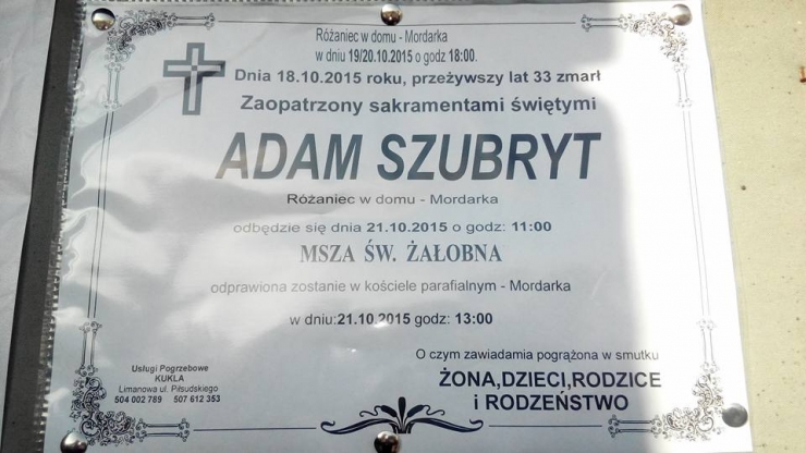 Adam Szubryt nie żyje. Zmarł jak żołnierz - na służbie. Kondolencje dla Rodziny oraz Klubu LKS Mordarka.