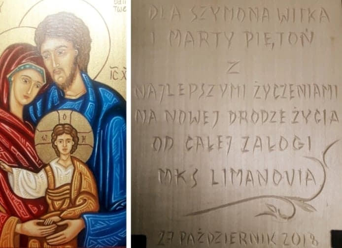 Szymon Witek otrzymał oryginalną Pamiątkę Ślubu - Ikonę w stylu bizantyjskim przedstawiającą Świetą Rodzinę, wykonaną przez młodą artystkę z Limanowej. Na awersie Pamiątki Ślubnej znalazła się Święta Rodzina, a na rewersie życzenia ślubne - tekst: